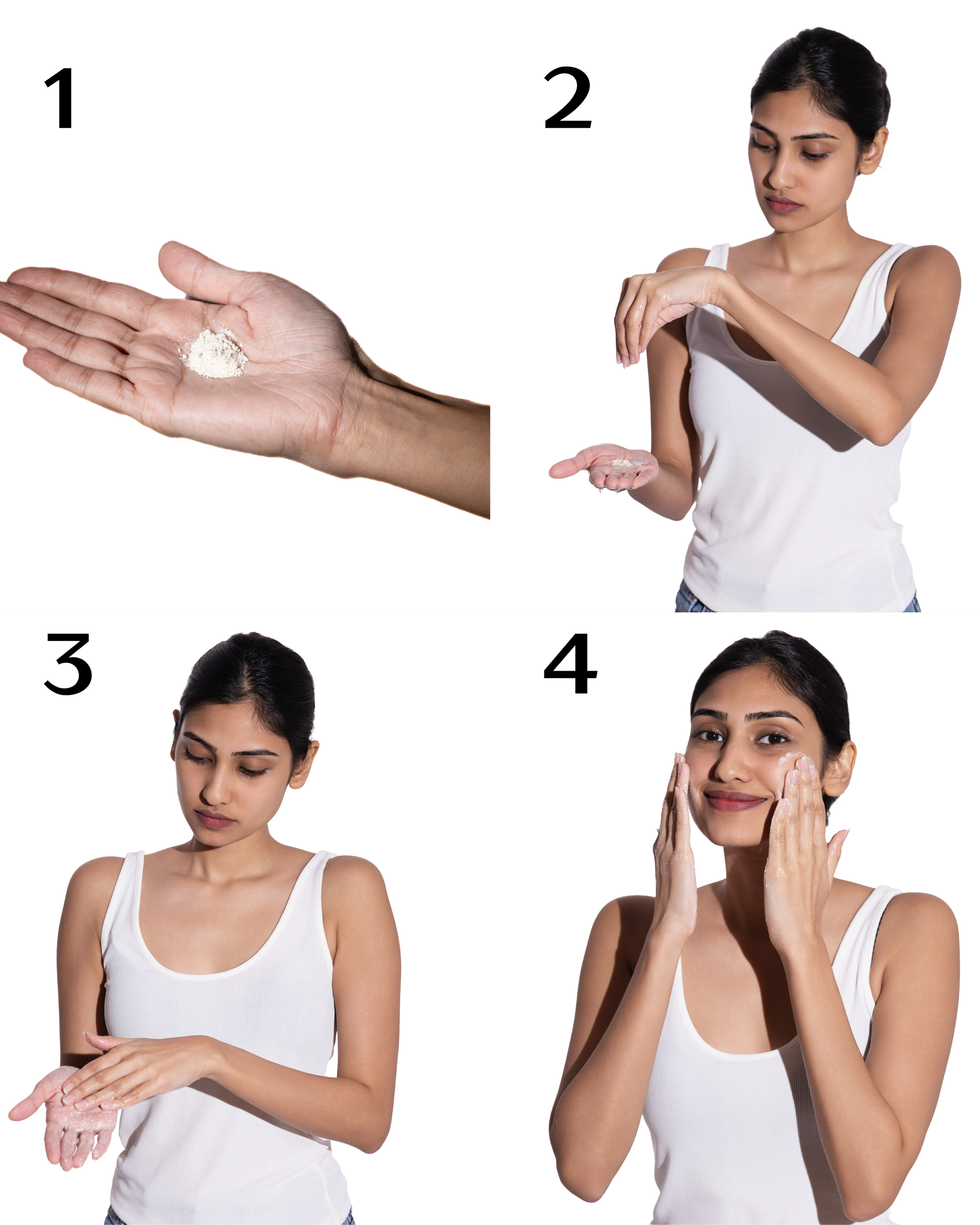 Just pour a small amount into your palm, add a few drops of water, rub to create a soft foam, and massage onto your face. Rinse thoroughly and pat dry.